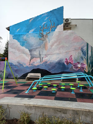 Her career extends into the film and advertising industries. From 2006 to 2016, she collaborated with acclaimed visual artist and art director Juan Danna, contributing to international productions —including Francis Ford Coppola’s Tetro— and numerous advertising campaigns under La Planta Art & Props. This experience in cinematic art direction profoundly informs her mural and spatial work, infusing it with scenographic depth and textural awareness.